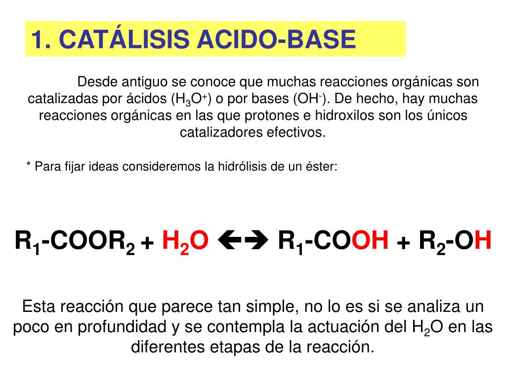 Para ilustrar mejor las diferencias entre la catálisis ácido-base general y específica, es útil considerar ejemplos de reacciones catalizadas por cada tipo. En la catálisis ácido-base general, un buen ejemplo es la formación de un enlace éster a partir de un ácido carboxílico y un alcohol. En este caso, el ácido protona el oxígeno del ácido carboxílico, facilitando la nucleofilia del alcohol y permitiendo que se forme el enlace éster de manera más eficiente.