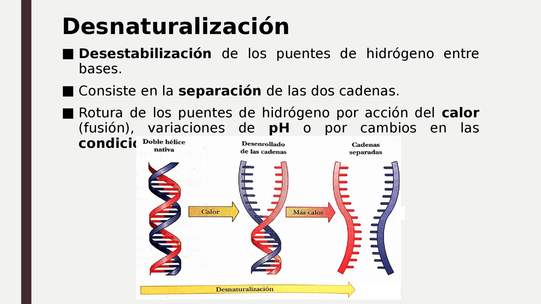 La desnaturalización del ADN se refiere al proceso en el cual la doble hélice del ADN se separa en dos cadenas individuales. Este fenómeno ocurre bajo condiciones específicas, como el aumento de la temperatura o la presencia de ciertos productos químicos. Durante la desnaturalización, los enlaces de hidrógeno que mantienen unidas las bases nitrogenadas se rompen, lo que provoca que las cadenas se separen. Este proceso es esencial para muchas técnicas de laboratorio, como la reacción en cadena de la polimerasa (PCR), que se utiliza para amplificar segmentos de ADN.