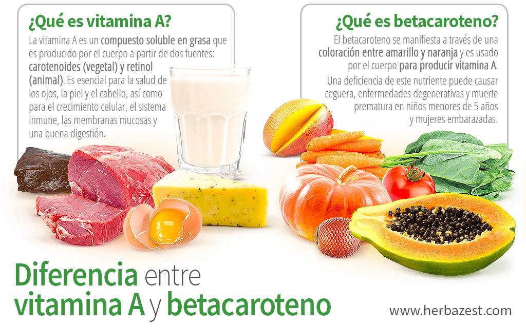 Diferencia entre la vitamina B y la vitamina B12Una de las diferencias más significativas entre la vitamina A y el betacaroteno es su origen y forma en la que se encuentran en los alimentos. La vitamina A preformada se obtiene de fuentes animales, mientras que el betacaroteno se encuentra en una variedad de frutas y verduras. Esto significa que las personas que no consumen productos animales pueden depender del betacaroteno para obtener suficiente vitamina A. La conversión de betacaroteno a vitamina A no es 100% eficiente, lo que significa que se necesita una mayor cantidad de betacaroteno para satisfacer las necesidades diarias de vitamina A.