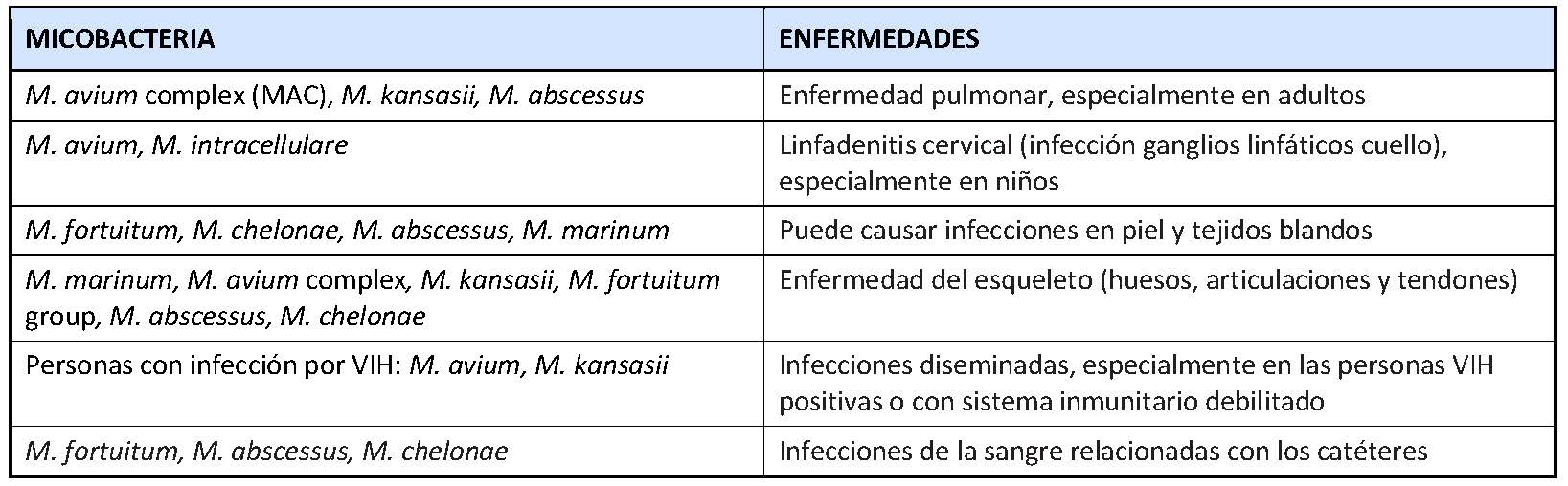 Las micobacterias no tuberculosas pueden causar una variedad de infecciones, aunque son menos comunes que la tuberculosis. Las infecciones más frecuentes incluyen neumonía, linfadenitis y infecciones cutáneas. Por ejemplo, Mycobacterium avium puede causar enfermedad pulmonar en personas con enfermedades pulmonares preexistentes o en individuos inmunocomprometidos, como aquellos con VIH/SIDA.