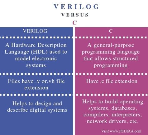 Diferencia entre Verilog y SystemVerilog- Propósito: Verilog se utiliza para modelar hardware, mientras que C se utiliza para desarrollar software.